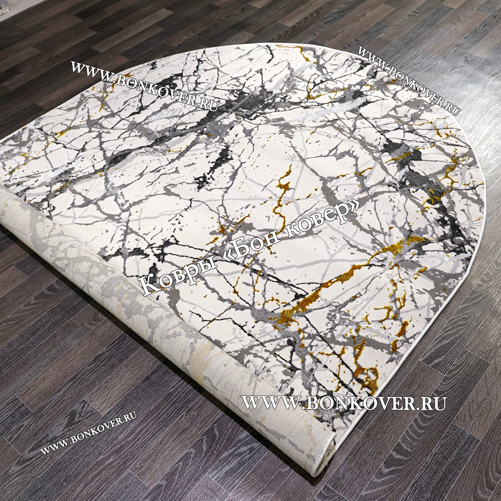 Изящный Турецкий Абстрактный Ковер Белый с Золотистым Арт 30325 наполняет интерьер квартиры теплом и уютом, гармонично сочетает в себе изящество и стиль. Он соткан из высококачественного сырья, прочный и долговечный.